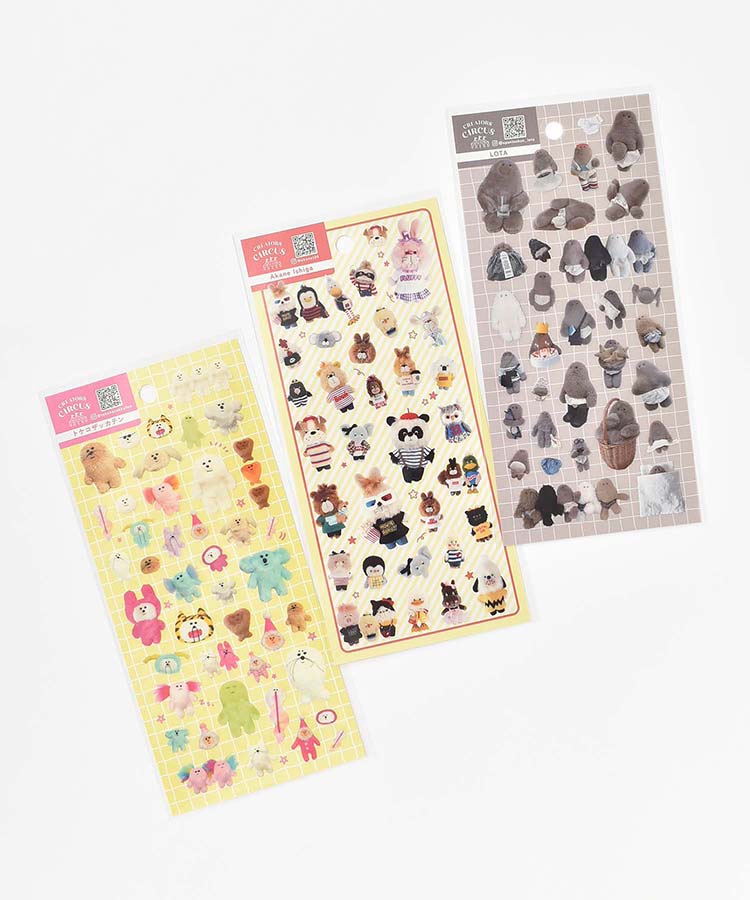 クリエイターの個性的なぬいぐるみアートがかわいいクリアシール。全部異なるデザインのシールが揃っているのも嬉しい!