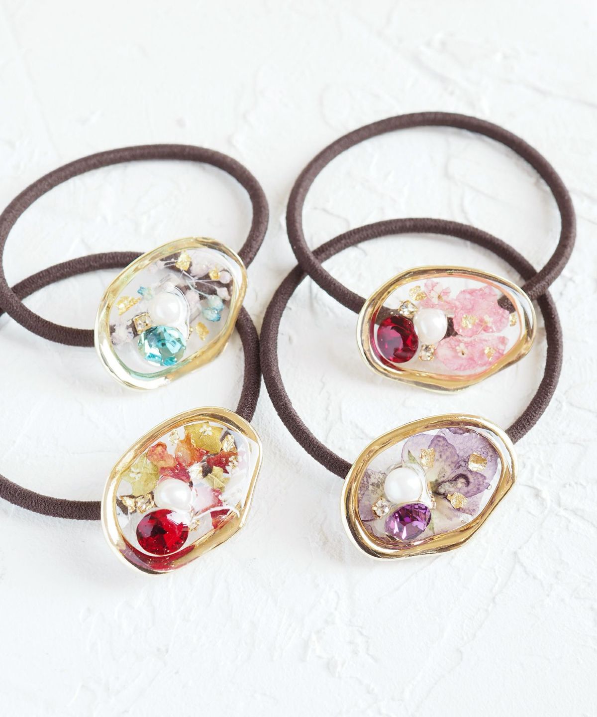 3月の誕生石である「アクアマリン」のカラーストーン、そして水色の石によく映えるカスミ草などのドライフラワーがレジンに閉じ込められ、なんとも幻想的(画像左上)。アクアマリンには「祈願成就」の石言葉もあるので、大事な試験を控えている彼女への誕生日プレゼントにもGOOD。