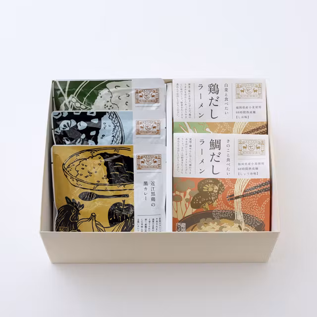 博多名物・鶏の水炊きから学んだ「白菜と食べたい鶏だしラーメン」、白川郷の郷土料理にちなんだ「牛すじすったてカレー」など、日本の食文化を感じるグルメを手軽に自宅で楽しめるセットです。