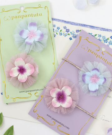 パンパンチュチュの子供用ヘアアクセサリーは、チュールの上にあじさいが咲いたような立体感のあるデザイン。柔らかなパステルカラーの色合いは好感度の高いアイテムです。ショートカットの女の子にはヘアピンタイプを選ぶなどヘアスタイルに合わせて選んでみて。