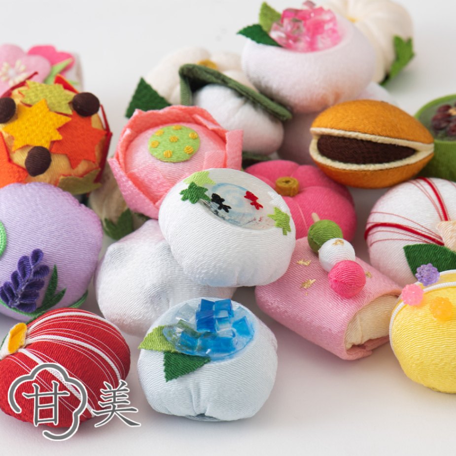 京都の生菓子をイメージした、ちりめん小物。椿の花や紫陽花、桃の花などの四季をモチーフにしていて、手に取るとふわっとお香が匂い立ちます。一つひとつ丁寧に手作業で作られており、小さいながらも高級感が感じられますよ。お手玉のような見た目に、少しだけ子供の心に戻れるギフトです。