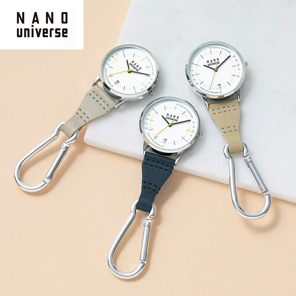 洗練された機能美が光る「NANO universe」の商品。カジュアルすぎず、男性・女性どちらでも使えるユニセックスデザイン。シンプルな蓄光文字盤は、ほどよいサイズ感で視認性もバッチリ。ベルトループ等に装着しやすいカラビナ付き。