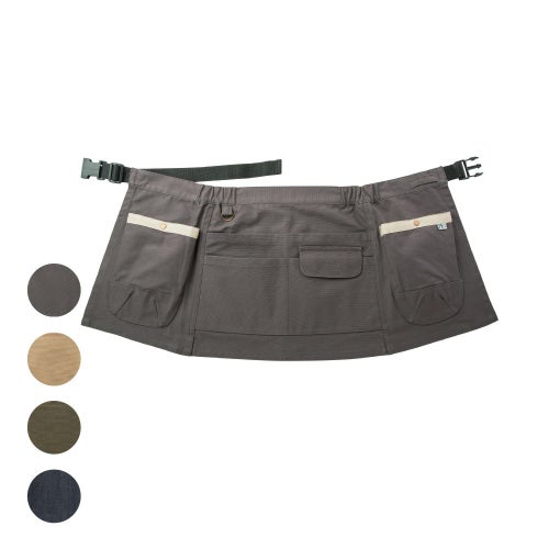 プロ農家さん向けの園芸用品を展開する「畑乃家」の商品。ポケットはA4 サイズが入る大型、スマホやペットボトル収納ができる立体タイプ等、計6つを配置。虫よけや鍵等を吊り下げられるDカンやループも!落ち着いた色目で、男性・女性どちらも使えるユニセックスデザイン。