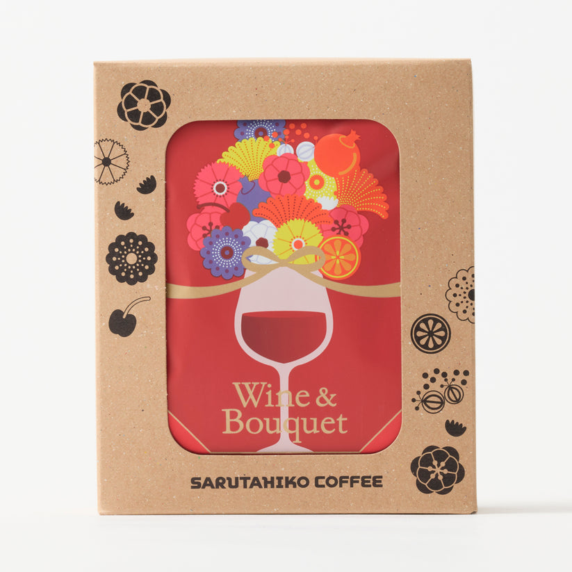 「ワインとブーケ」がテーマのコチラ。女性へのちょっとしたお礼やお祝いのギフトにピッタリな、華やかなパッケージ。軽やかな口当たりの中煎り。ワインを思わせる瑞々しいフレーバー、柑橘の花々のような甘く爽やかな香りが心地よい!