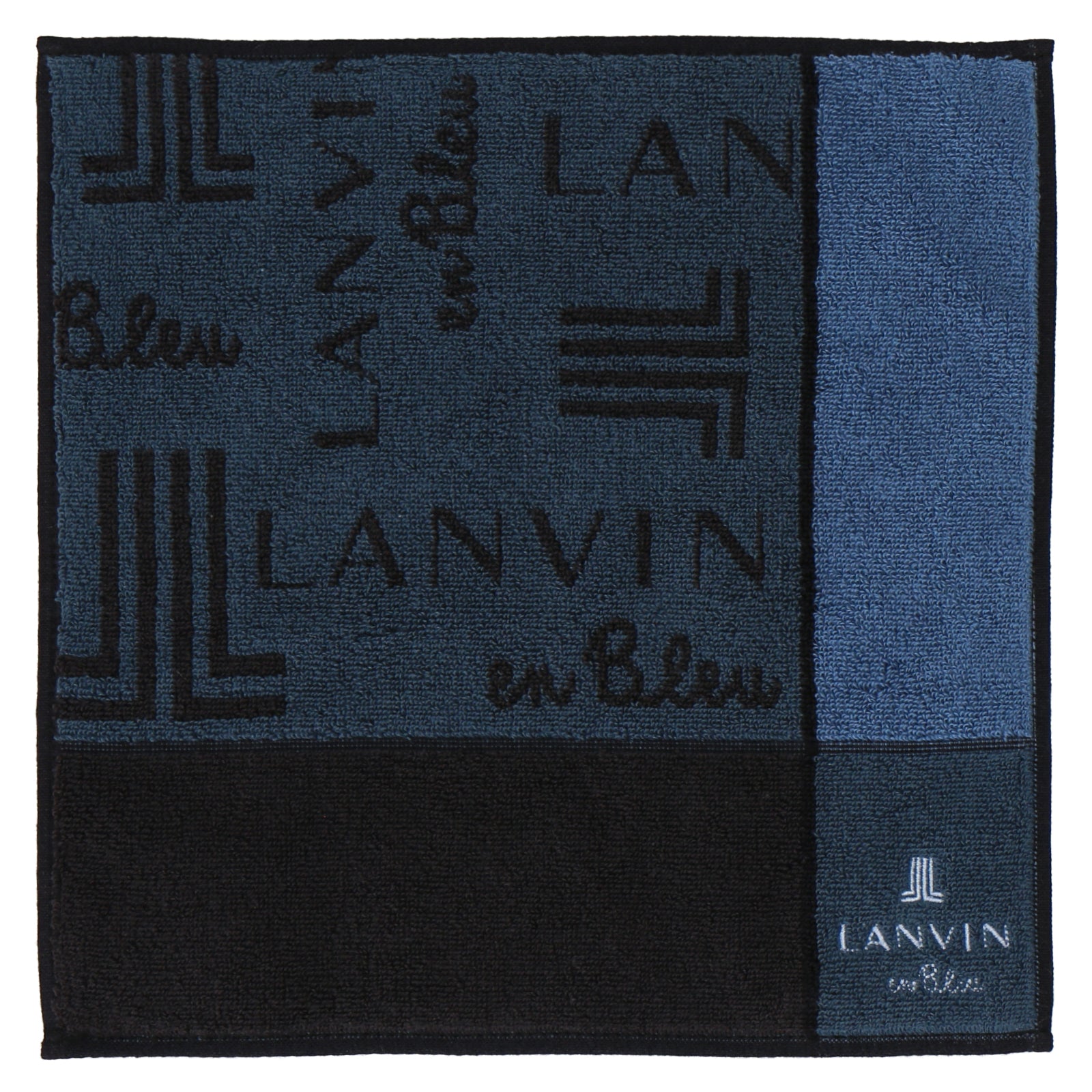「LANVIN en Bleu(ランバン オン ブルー)」のメンズハンカチ。深みのあるカラーにロゴ模様が個性的。オンオフどちらでも使いやすいデザインです。