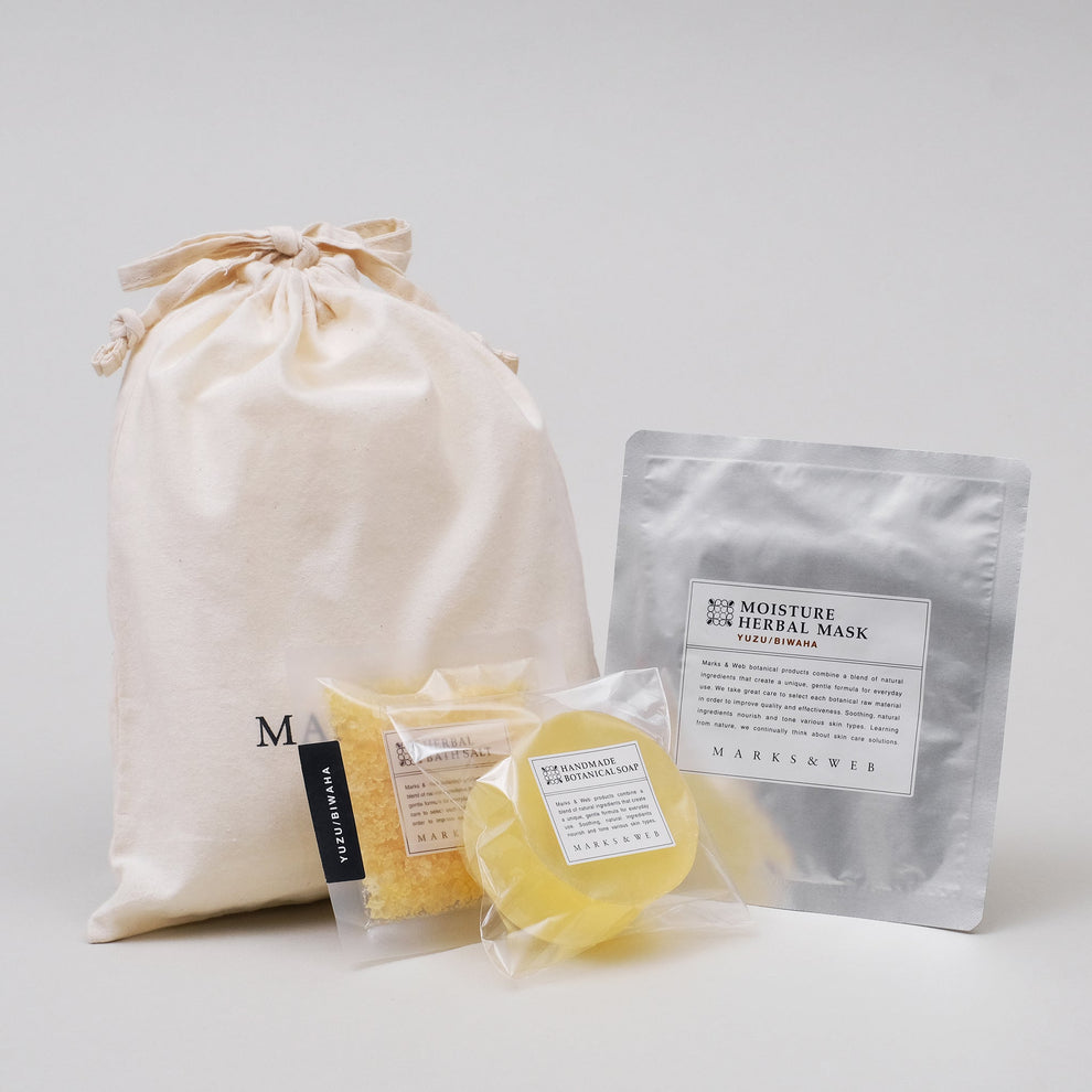 「MARKS&WEB(マークスアンドウェブ)」は、植物性素材を使用したフェイスケアやボディケア商品を展開する日本のコスメブランド。こちらはさわやかな柚子&ビワの香りが特徴のバスソルトと石鹸、シートマスクのセット。巾着ポーチに入っているのもうれしいですね。気の利いた内祝いのお返しに。